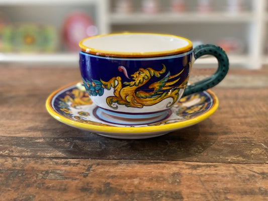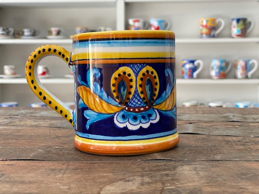 Eugenio Riccirelli is one of the most beloved artisans in Deruta. He began working at 13 in a painting factory, then became an apprentice for the esteemed Franco Mari, eventually running Franco Mari’s studio for many years. Eugenio is known for his geometric designs and hues of blue, produces his works in 12 simplified patterns and 65 full designs.