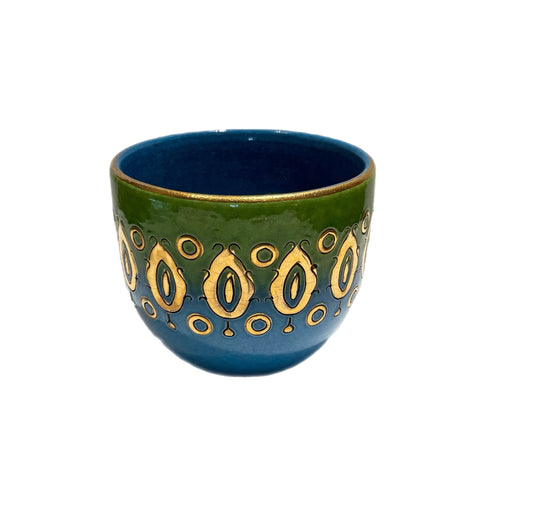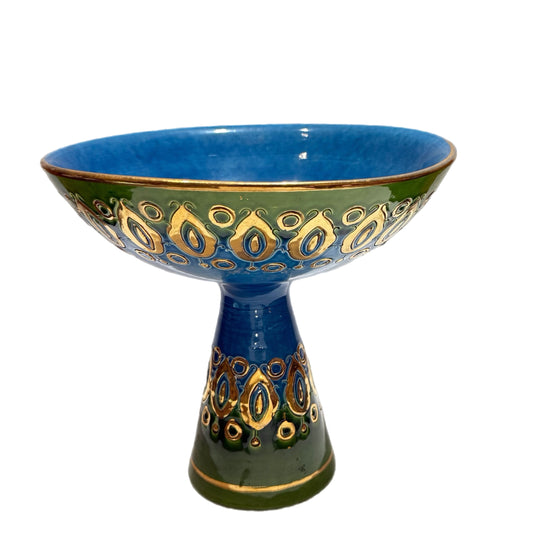 Introducing timeless elegance to your home with this authentic vintage Aldo Londi Bitossi ceramics, a rare and collectible ceramic artwork handmade in Italy during the 1960s. Created by renowned Italian designer Aldo Londi, this original Bitossi piece features the signature blue and green glaze of the iconic Rimini Blu collection, enriched with luxurious 24 karat gold accents.