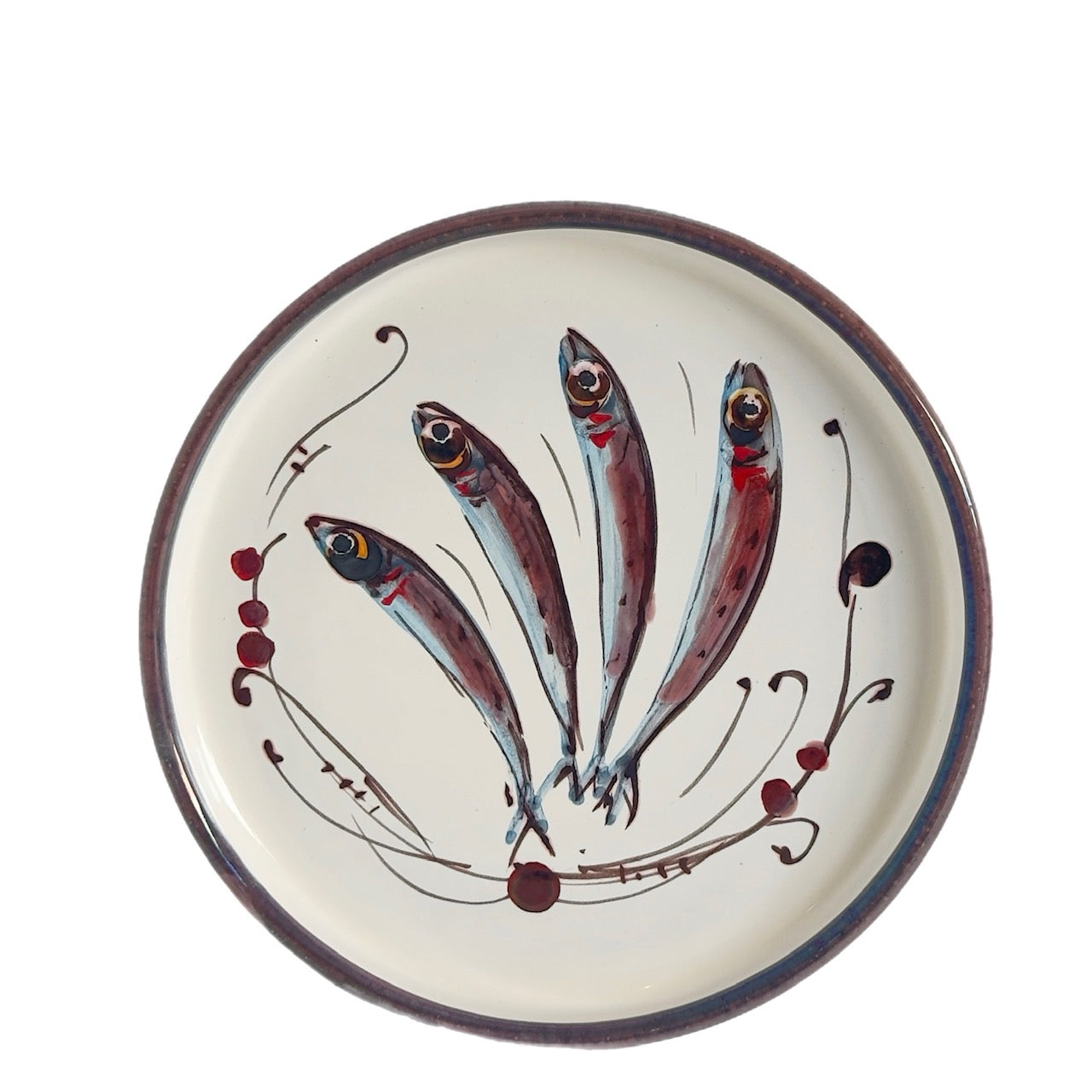 This hand-painted Vignoli ceramic tray with fishies design is perfect for an appetizer plate, tray or simply to display. Copper paint is used and when fired it achieves a luminous finish. This is a unique gift for any occasion.