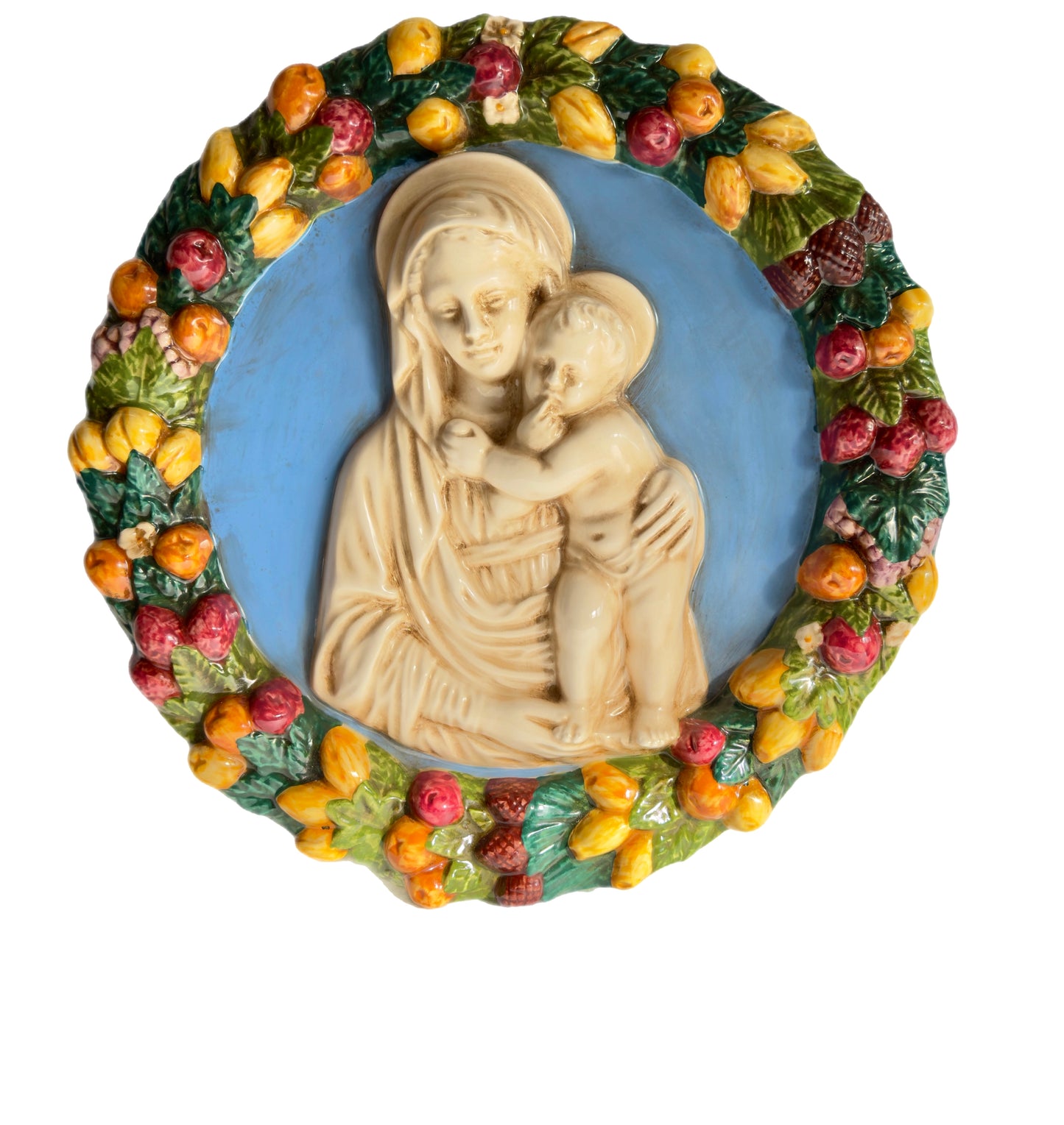 Florence was the home to the famous Della Robbia artists during the early Renaissance period. Luca Della Robbia was a 15th century Italian sculptor from Florence, who was noted for his terra cotta roundels. He developed a pottery glaze that made his creations more durable in the outdoors and thus suitable for exterior of buildings. Montelupo Fiorentino, a fabled Ceramic Town outside of Florence, is where these Della Robbia Style plaques have been produced for centuries. Many are one-of-a-kind Della Robbias.