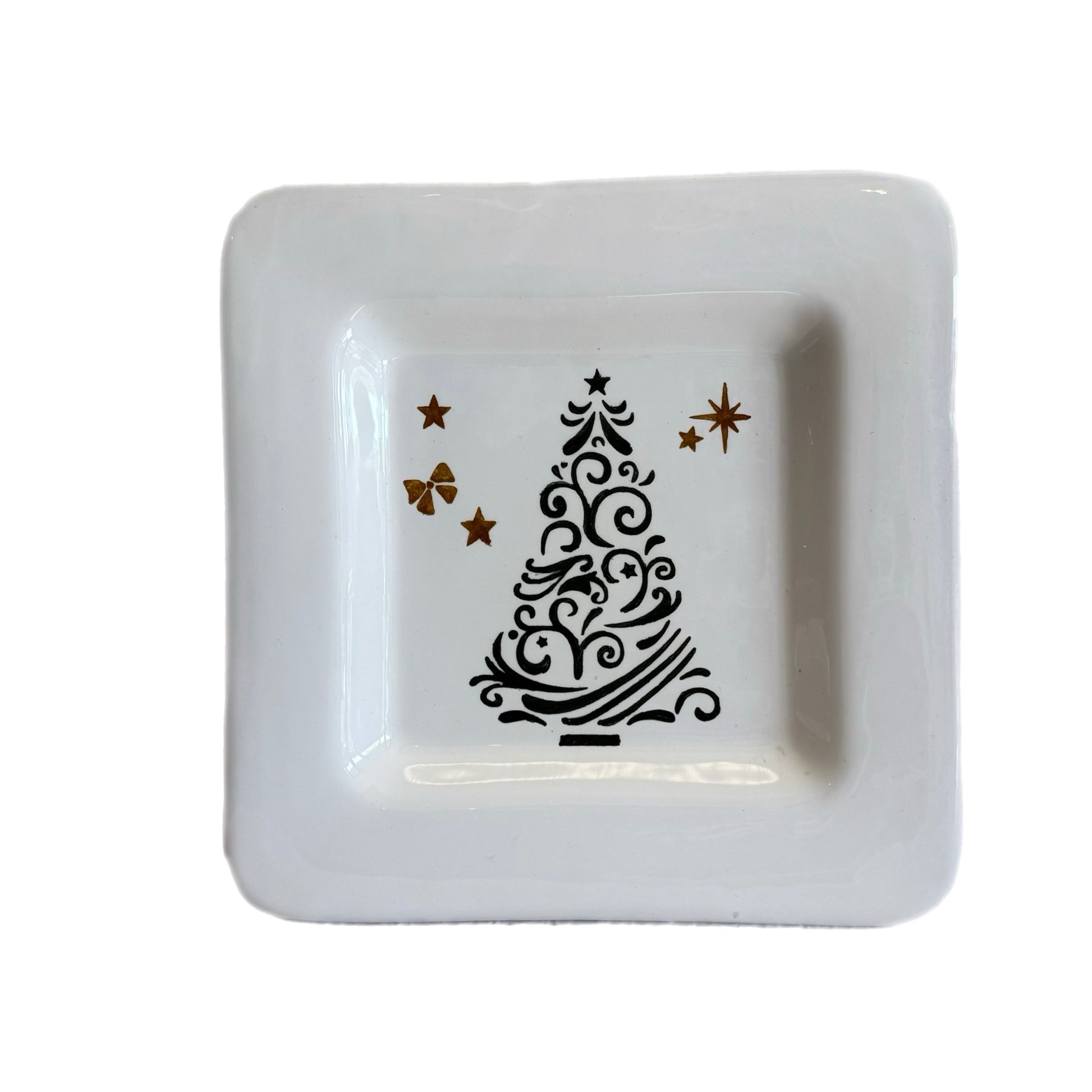 Featuring a beautifully stylized Christmas tree motif in deep green with shimmering gold-inspired stars, this tray captures the warmth, charm, and festive spirit of the Italian holiday season. Its crisp white glaze and refined square silhouette make it the perfect accent for Christmas entertaining—ideal for serving cookies, biscotti, antipasti, or for use as a decorative holiday display.