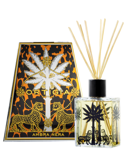The Ambra Nera Perfume Diffuser (200 ml) diffuses a rich fragrance of amber resin interwoven with labdanum, oak musk, galbanum, vetiver, patchouli, and exotic spice woods—evoking the bold, mystical spirit of Mediterranean evenings .
