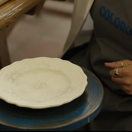 Raffaellesco - This is Biordi’s most appreciated pattern of classic Italian dinnerware and pottery. The stylized dragon, seen as the central motif, was reputedly painted in the 16th century by Raphael, the master painter and architect of the Italian High Renaissance. The Raffaellesco dragon has come to be known as a benevolent deity who bestows good luck and fair winds to seagoing merchants, thus the puffs of wind steaming from the dragon’s mouth. It is hailed as one of Deruta’s most challenging designs of any Majolica out there, as its intricacy requires an unimaginably steady hand.