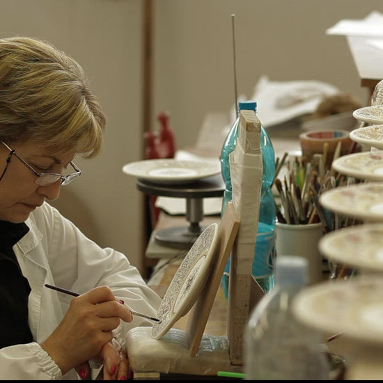 Raffaellesco - This is Biordi’s most appreciated pattern of classic Italian dinnerware and pottery. The stylized dragon, seen as the central motif, was reputedly painted in the 16th century by Raphael, the master painter and architect of the Italian High Renaissance. The Raffaellesco dragon has come to be known as a benevolent deity who bestows good luck and fair winds to seagoing merchants, thus the puffs of wind steaming from the dragon’s mouth. It is hailed as one of Deruta’s most challenging designs of any Majolica out there, as its intricacy requires an unimaginably steady hand.