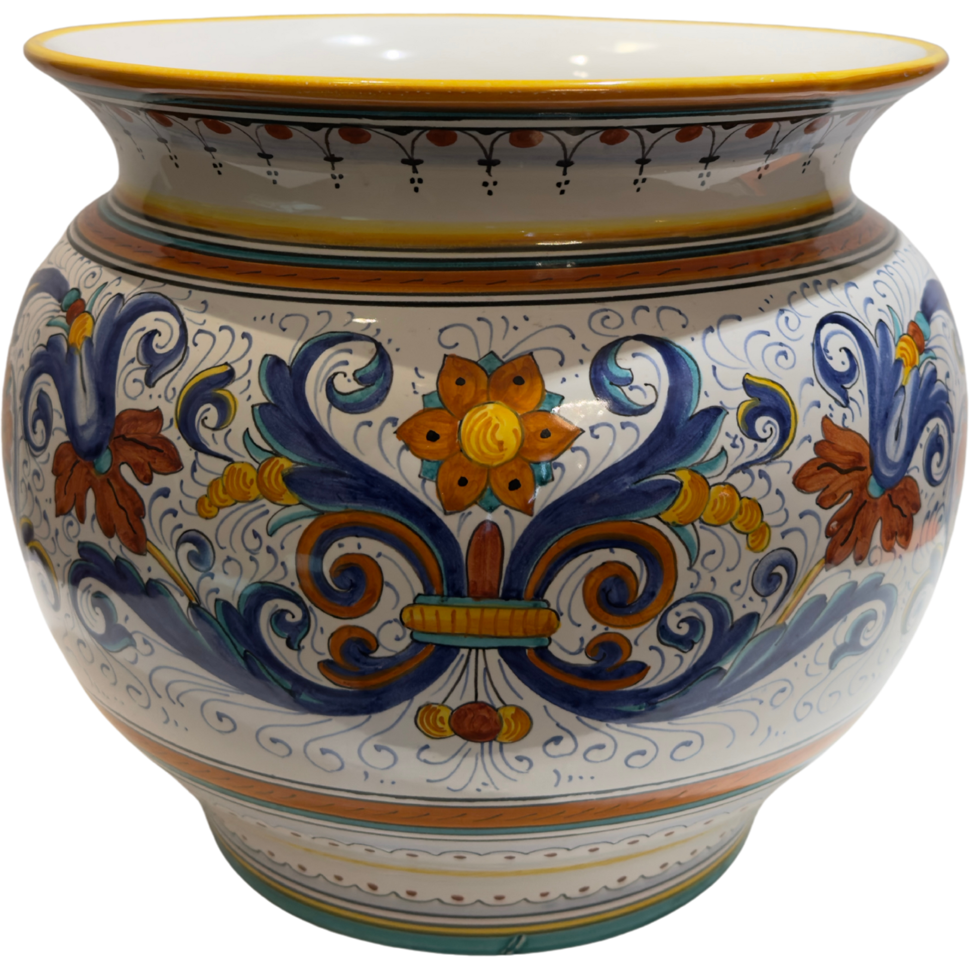 Executed in the classical Ricco Deruta tradition, the planter is richly adorned with Renaissance-inspired scrollwork, stylized floral motifs, and symmetrical medallions painted freehand in cobalt blue, deep green, warm ochre, and golden yellow. The generously proportioned form—traditionally used for herbs, citrus, or decorative plants—reflects the Italian philosophy that even utilitarian garden objects should be objects of beauty.
