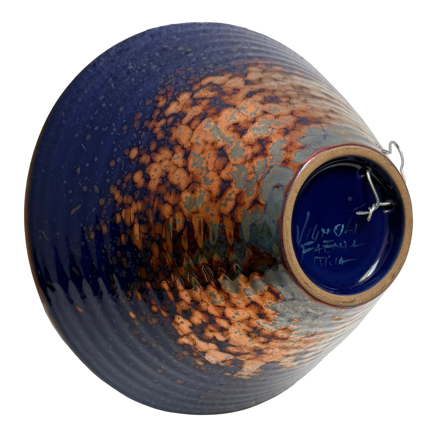 The striking conical form makes a sophisticated statement whether placed on a table as a centerpiece or hung on the wall as a work of art. The deep blue glaze, layered with Vignoli’s signature metallic copper finish, gives the surface depth, movement, and an almost luminous quality—no two bowls are ever the same.