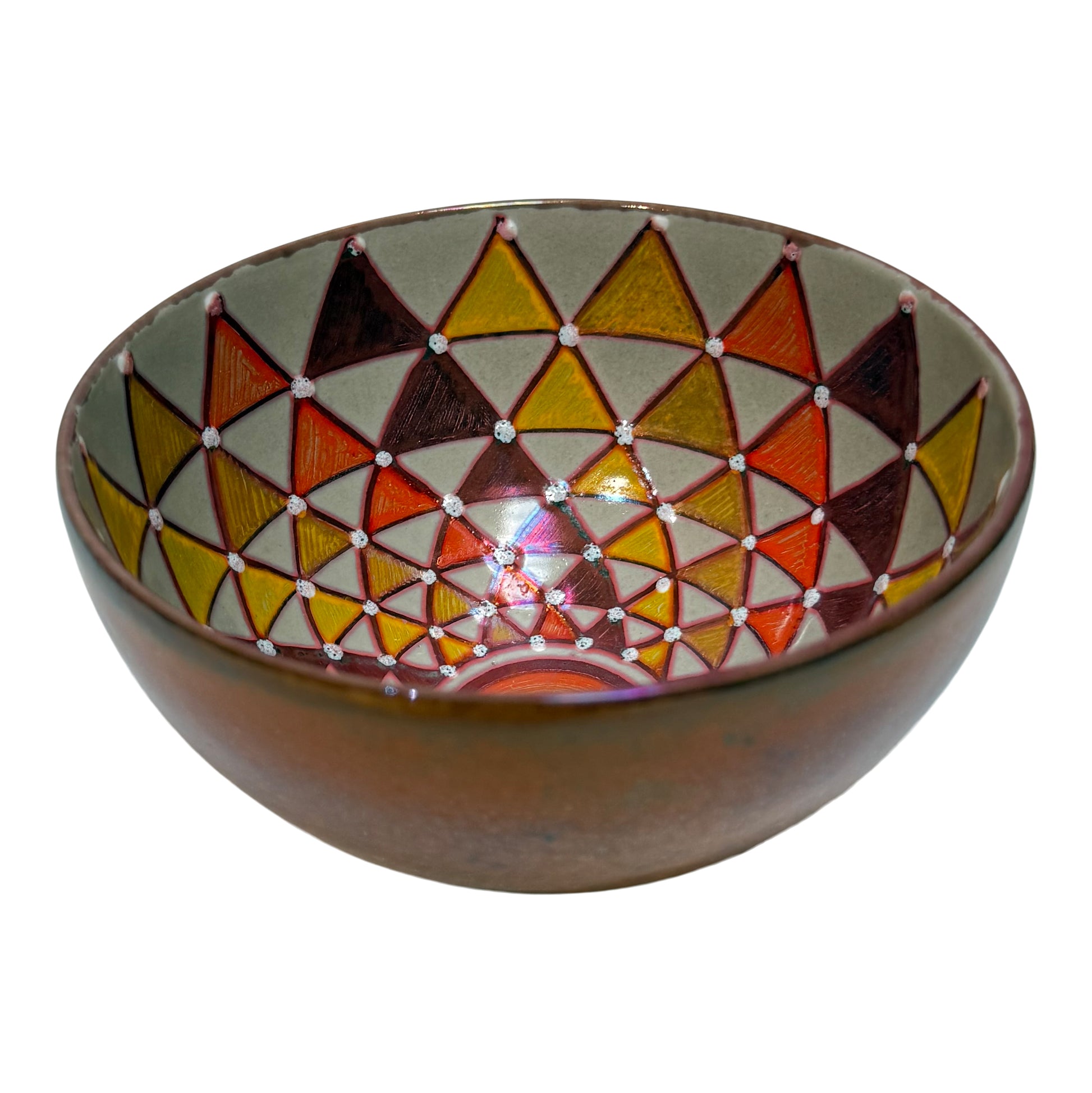 Hand-Painted & Unique – No two bowls are alike; each features its own geometric pattern and copper-toned finish.