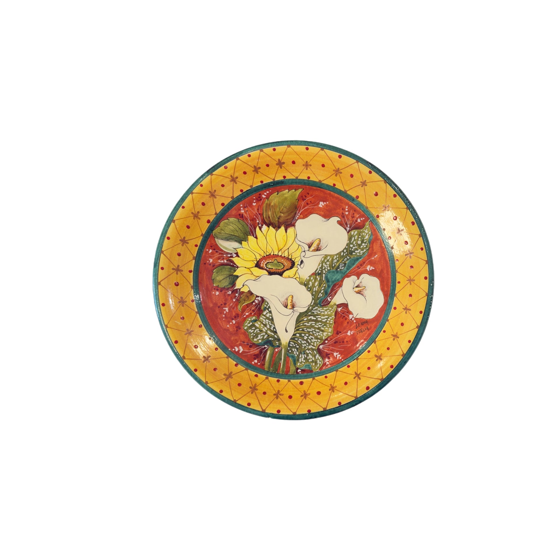 This exceptional hand-painted Italian wall plate by Leona is a beautiful depiction of Calla Lily's and Sunflowers. Created in Tuscany, the hand-painted composition features flowers of the Tuscan countryside.