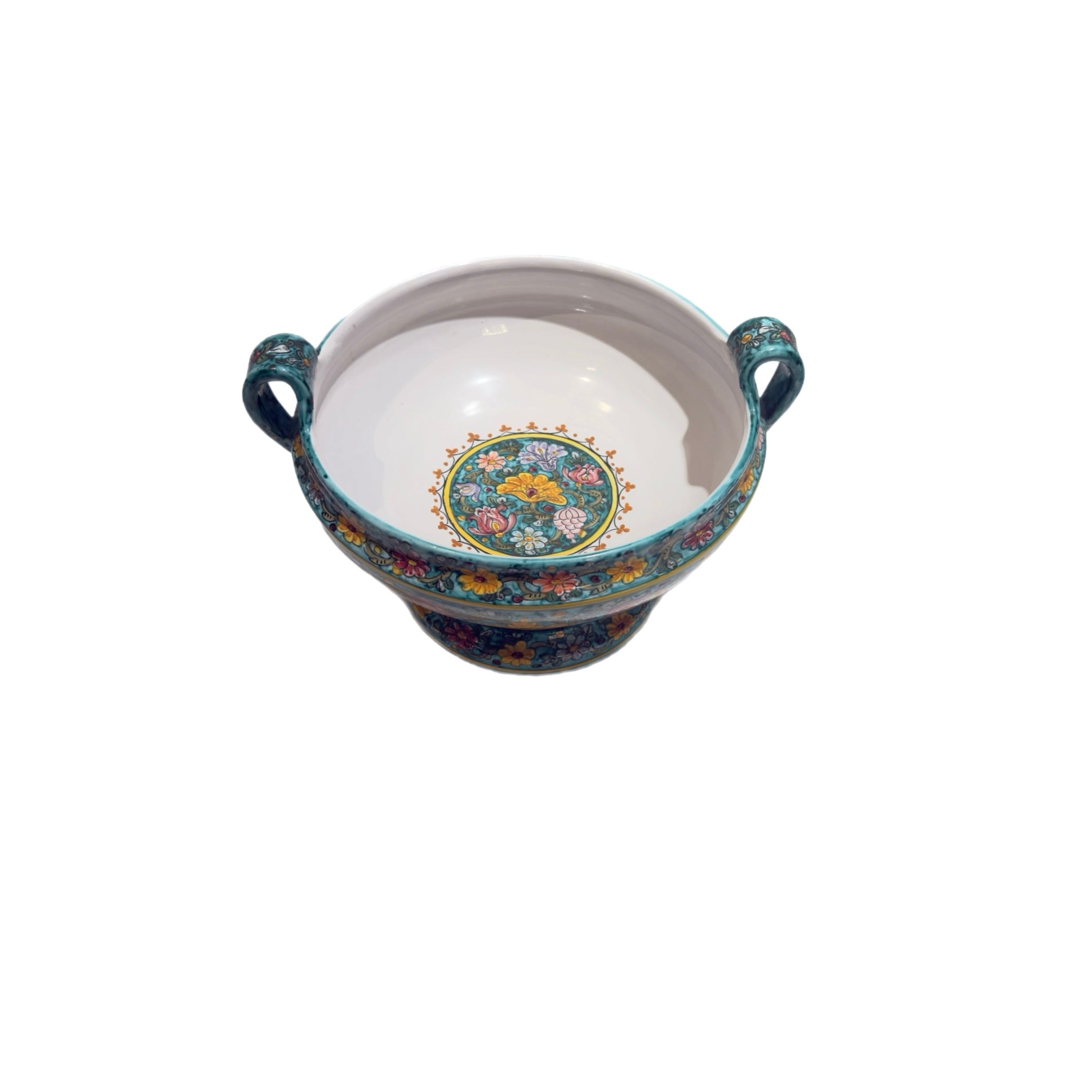 Painted entirely by hand, the surface is richly adorned with an allover floral tapestry—golden blossoms, scrolling foliage, and jewel-toned accents layered over a soft teal ground. Mineral pigments and glossy glazes create depth and movement, allowing each brushstroke to remain visible and expressive. The interior is subtly finished to complement the exterior decoration, enhancing the overall elegance of the piece.