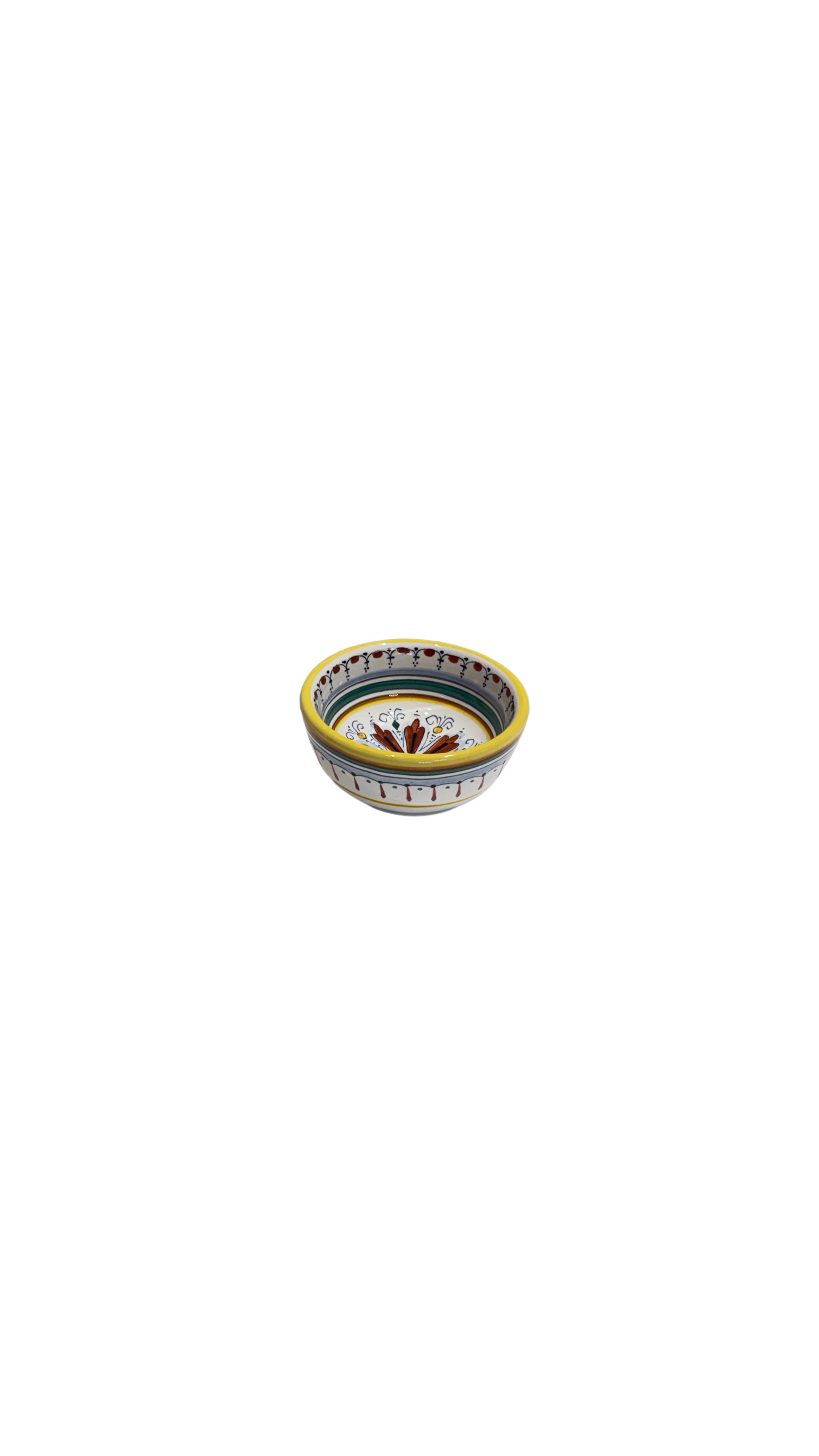 Decorated in the classic Ricco Deruta style, the bowl features Renaissance-inspired scrollwork, floral motifs, and rhythmic banding painted freehand in cobalt blue, green, warm ochre, and golden yellow. Its intimate scale reflects the Italian tradition of serving—designed for condiments, olives, sauces, or spices—where even the smallest table objects were treated with care and artistry.